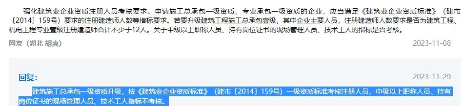 住建部发布《住房城乡建设部关于进一步加强建设工程企业资质审批管理工作的通知》的第六条:强化建筑业企业资质注册人员考核要求。申请施工总承包一级资质、专业承包一级资质的企业,应当满足《建筑业企业资质标准》(建市〔2014〕159号)要求的注册建造师人数等指标要求。