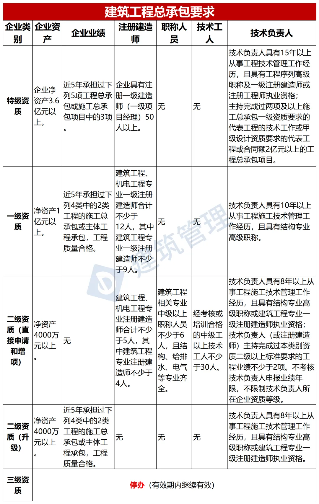 本文根据最新政策对各类施工总承包企业资产、企业业绩、人员要求进行汇总,供读者参考!